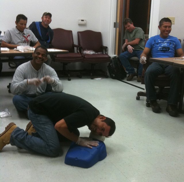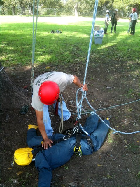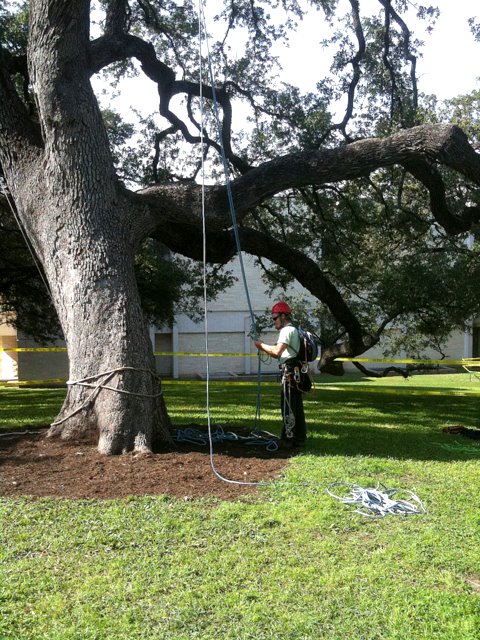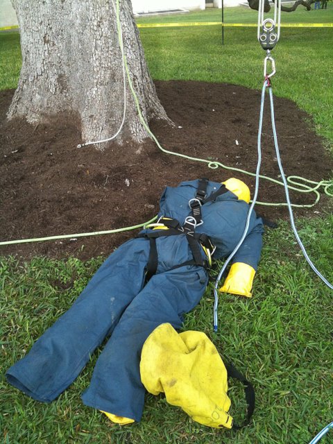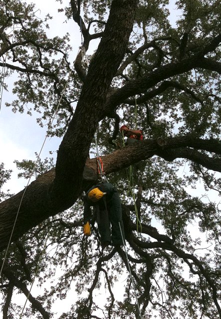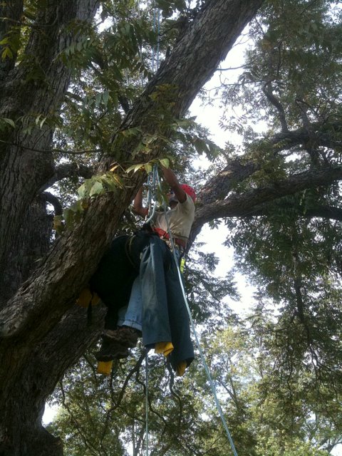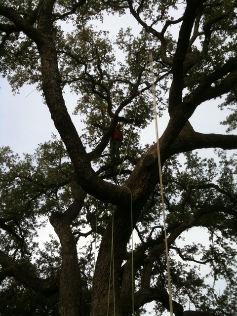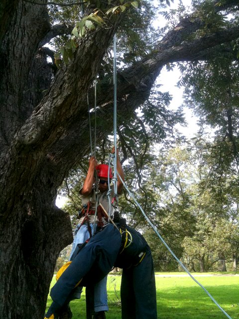 One of the goals of the workshop was to prepare my crew members for the ISA’s Certified Tree Worker tests. The tree worker certification is different from the certified arborist in many ways. For starters, it is much more difficult to get. The experience requirement is less, but the demonstration of knowledge is much, much more. To become a certified arborist you need only to have three years experience and to pass a written test. To become a certified tree worker, you must have 1.5 years experience and pass a written test; plus, pass a skills/climbing test, pass a knot tying test, maintain CPR/first aide certification and obtain aerial rescue training. For more info on this you can visit ISA Texas website.